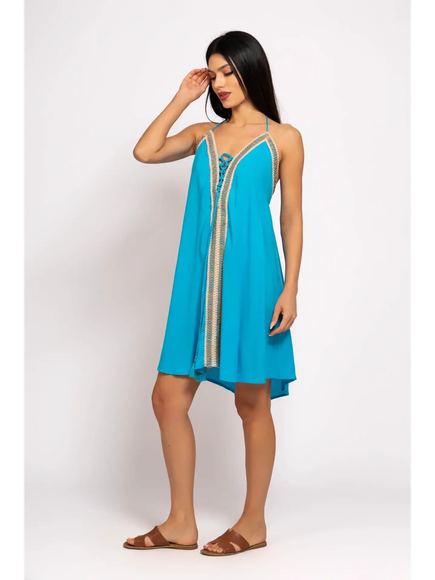 Een turquoise korte jurk met een aansluitend lijfje en subtiele touwdetails die over de lengte lopen. Het ontwerp is strak en gestructureerd, met zachte verticale lijnen die textuur en beweging toevoegen. 🇬🇷 ONTWERP IN GRIEKENLAND